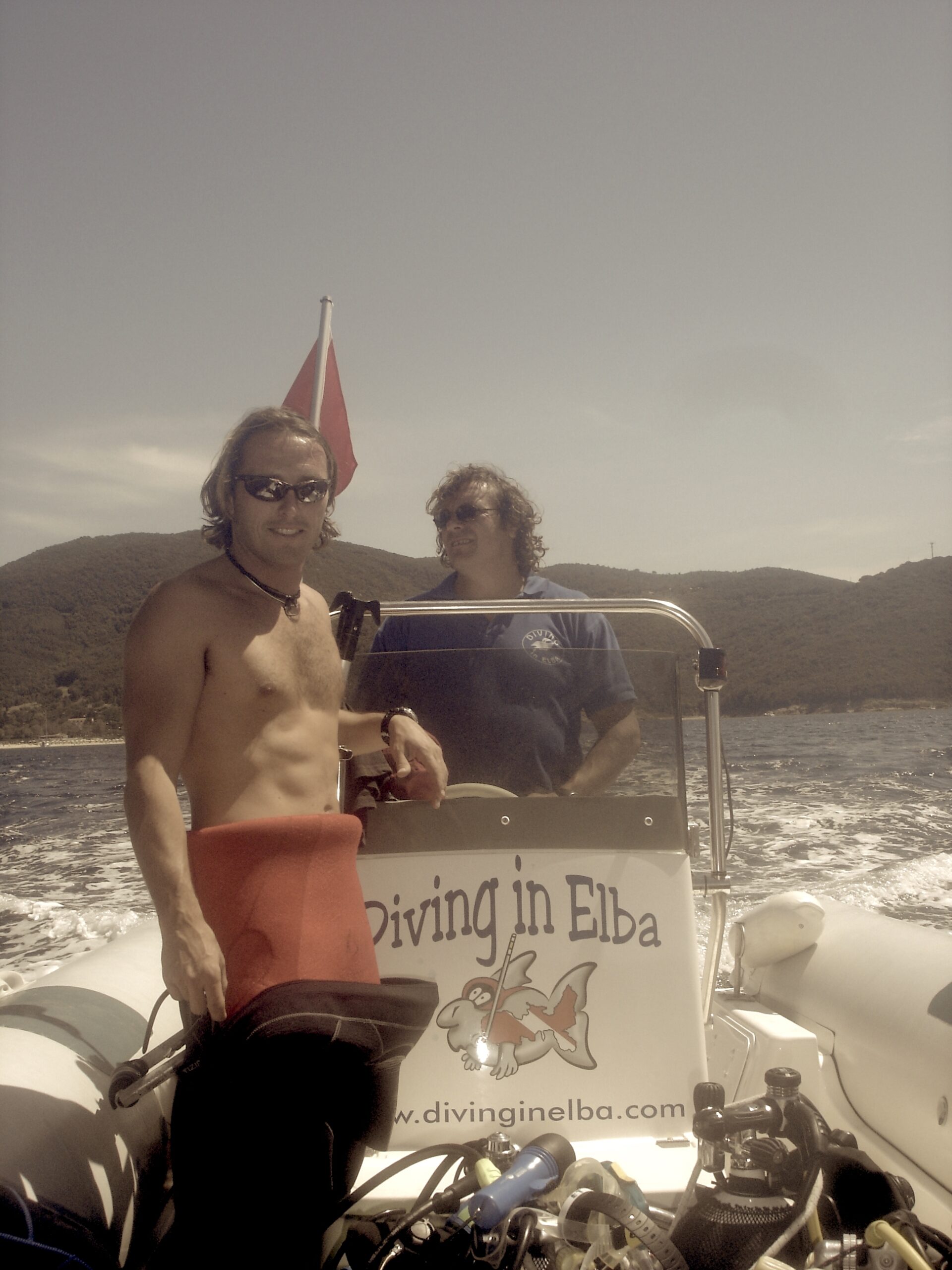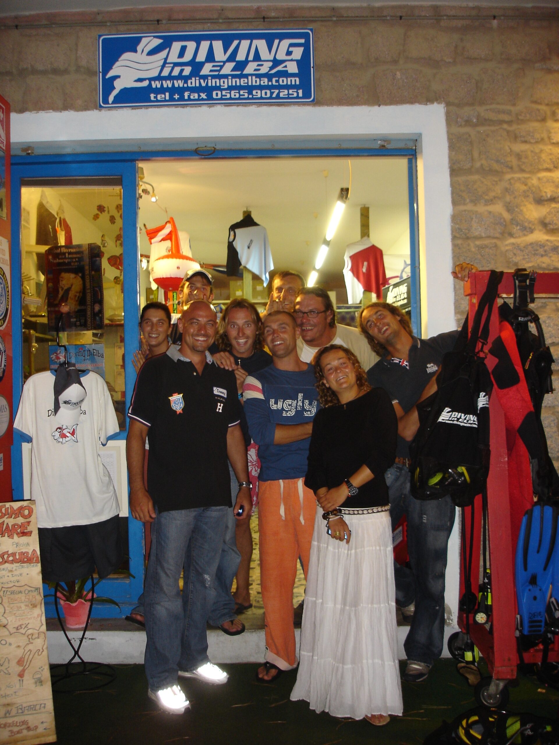 Fede, der Makako, war noch nicht da, aber ich setzte ihn bereits unter Druck, zu uns zu kommen – und kurz darauf kam er tatsächlich… um nie wieder zu gehen! Die andere Gesellschafterin war Valeria, ebenfalls frisch aus Mailand angekommen und mit wenig Erfahrung im Meer – alles war neu, und vor allem teilten wir alle ein großes, wunderbares Abenteuer mit dem Ziel, Diving in Elba wieder zu einem erfolgreichen Tauchzentrum zu machen, nachdem wir es in einem schlechten Zustand vom vorherigen Besitzer übernommen hatten.