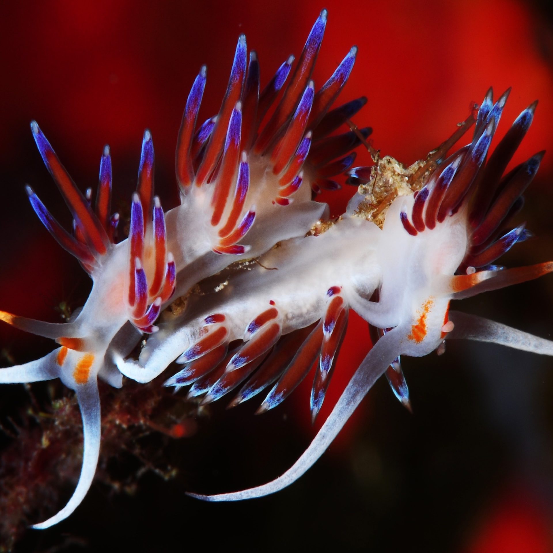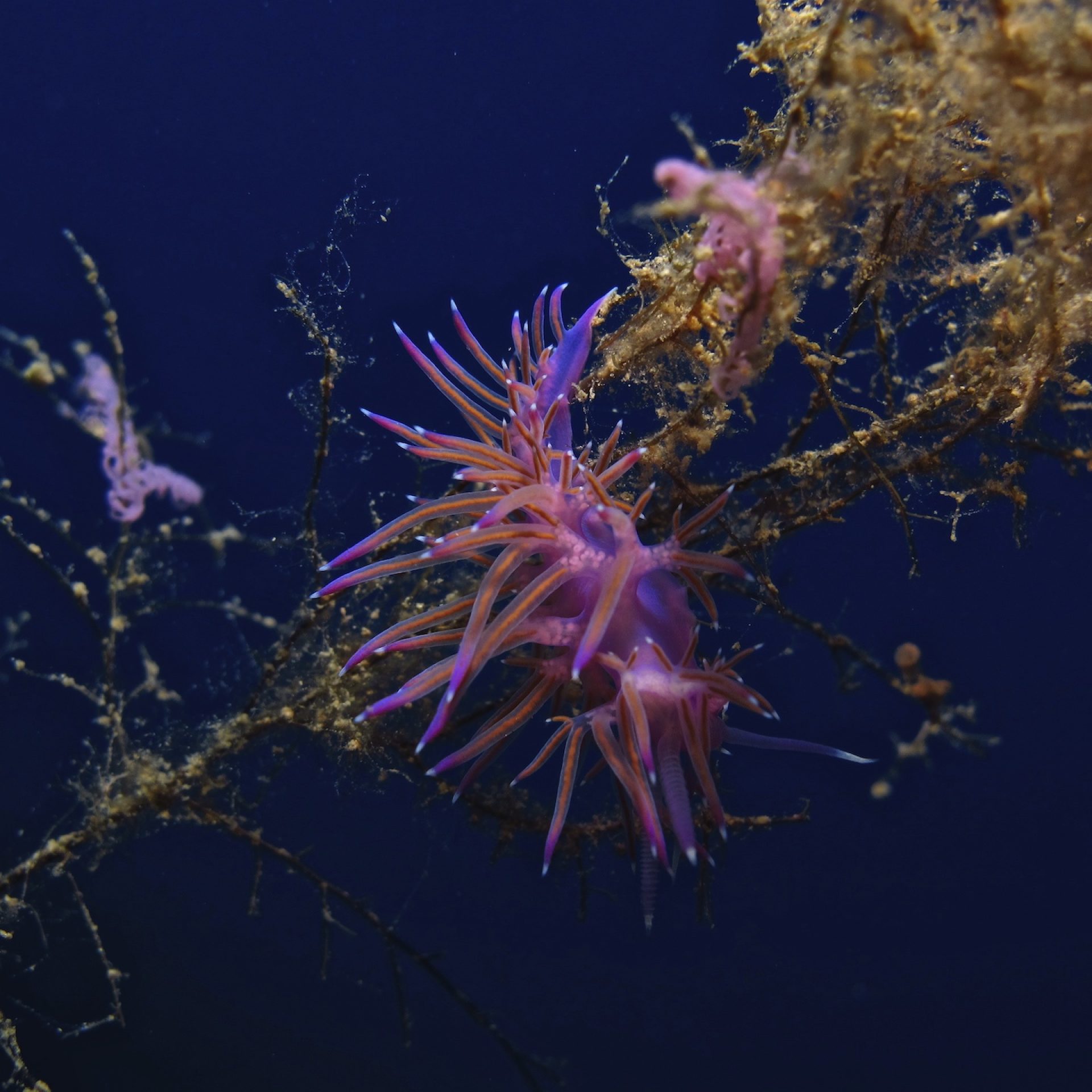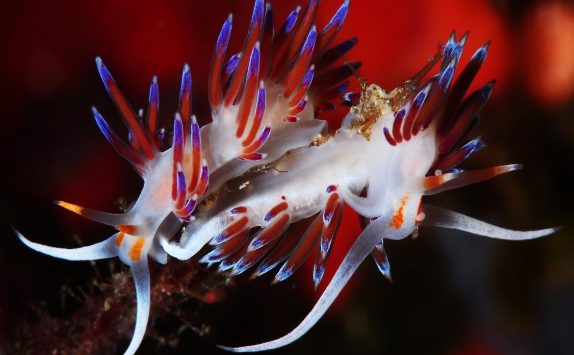 Die Flabellinen, unter denen die bekanntesten die Flabellina affinis und die Cratena peregrina sind, ernähren sich im Allgemeinen von Hydroidpolypen, Organismen, die zum Phylum der Cnidaria oder Coelenterata gehören, demselben Stamm, zu dem auch die Quallen zählen und mit denen sie die charakteristischen Nesselzellen gemeinsam haben. Es handelt sich um koloniale Organismen, die insgesamt wie kleine grüne/transparente Bäumchen erscheinen, von harter, aber elastischer und flexibler Beschaffenheit, deren Polypen (genau POLYPEN, nicht OKTOPUSSE, und aufgrund der Nesselzellen könnte ihre Bestellung im Restaurant schmerzhafte Reizungen verursachen!) einen Körper besitzen, bei dem vor allem der Mundapparat auffällt, der vollständig der Blütenkrone einer Blume ähnelt. Die Flabellinen sind gastropode Weichtiere, die sich durch leuchtende Farben und durch Cerata auszeichnen, längliche Auswüchse, die sowohl der Vergrößerung der Körperoberfläche dienen (bei vielen Exemplaren erfolgt die Atmung über die Haut) als auch der Verteidigung und der Verdauung. Tatsächlich können sie im Inneren Divertikel der Hepatopancreasdrüse enthalten, während einige mit Organen ausgestattet sind, die die Nesselzellen der Organismen sammeln, von denen sie sich ernähren. Um sicherzustellen, dass ihre Nachkommen ausreichend Nahrung für ihre Entwicklung erhalten, legen diese Nacktschnecken ihre Eier (in dünnen, je nach Art unterschiedlich gefärbten Fäden gruppiert, zum Beispiel sind die der Flabellina affinis violett, während die der Cratena peregrina weiß sind) direkt zwischen die Zweige der Hydroidpolypen, insbesondere im Frühling und Sommer. Um diese wunderschönen, kleinen, aber äußerst farbenprächtigen und detailreichen Tiere zu finden, müssen wir also während des Tauchgangs lediglich jedes „kleine Bäumchen“ (Hydroid) aufmerksam betrachten!