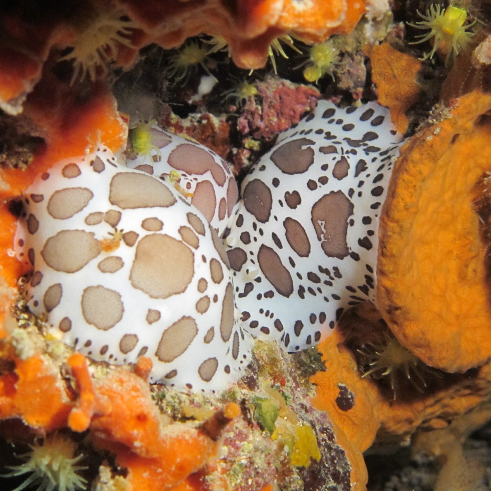 Beginnen wir mit Ihrer Majestät, der „See-Kuh“ oder Discodoris atromaculata. Sagen wir, sie ist aufgrund ihrer Größe und der charakteristischen, ziemlich auffälligen Färbung am einfachsten zu finden… ratet mal warum? Das hängt davon ab, was sie frisst: Sie ernährt sich hauptsächlich von einer besonders harten Schwammart, der Petrosia ficiformis, von der sie einen Teil der Verdauungsrückstände speichert. Dadurch wird die „See-Kuh“ hart und wenig genießbar, und um dies zu signalisieren, präsentiert sie sich besonders auffällig. Diese Art der Färbung wird als aposematisch bezeichnet und findet sich bei giftigen, ungenießbaren oder einfach besonders schlecht schmeckenden Organismen. Auf diese Weise können Fressfeinde sie sofort erkennen und vermeiden es, sie zu fressen! Ist das nicht genial!? Natürlich gibt es auch diejenigen, die sich dies zunutze machen und, obwohl sie äußerst schmackhaft und harmlos sind, dieselben Farben annehmen, um diejenigen zu täuschen, die sie fressen wollen. Hat sie ihre Beute gefunden, greift die „See-Kuh“ deren Oberfläche mit der Radula an (also einer Art gezahntem, chitinhaltigem Band, ähnlich einer Zunge) und raspelt die Oberfläche ab; nach dieser Behandlung erscheinen die gefressenen Stellen heller. Zusammengefasst: Um die „See-Kuh“ zu finden, genügt es, die Schwämme zu beobachten, bis man Petrosia ficiformis entdeckt, die massiv, kompakt und hart (wie ein Stein, daher der Name) erscheint, mit rauer Oberfläche, bedeckt von Osculi (den charakteristischen Öffnungen der Schwämme, aus denen das gefilterte Wasser austritt) und mit rötlich-violetter Färbung. Die Färbung ist auf das Vorhandensein von Cyanobakterien zurückzuführen, die im beleuchteten Teil des Schwamms leben.