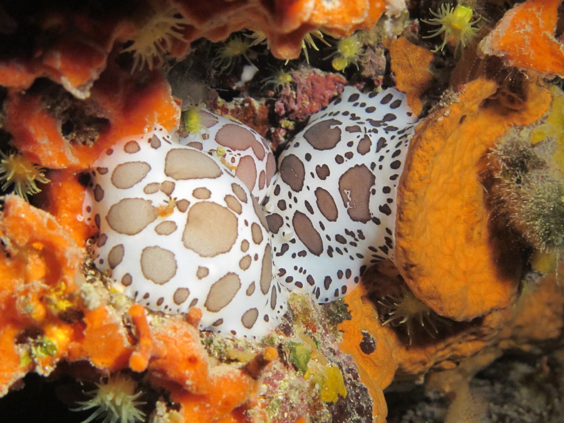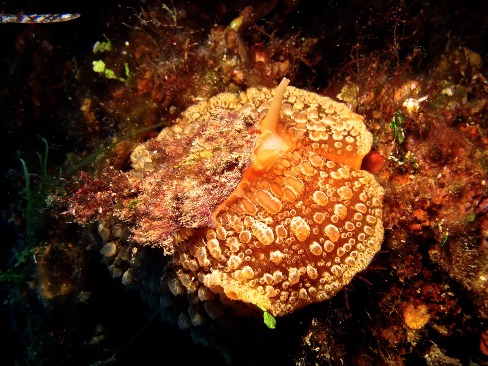 Beginnen wir mit Ihrer Majestät, der „See-Kuh“ oder Discodoris atromaculata. Sagen wir, sie ist aufgrund ihrer Größe und der charakteristischen, ziemlich auffälligen Färbung am einfachsten zu finden… ratet mal warum? Das hängt davon ab, was sie frisst: Sie ernährt sich hauptsächlich von einer besonders harten Schwammart, der Petrosia ficiformis, von der sie einen Teil der Verdauungsrückstände speichert. Dadurch wird die „See-Kuh“ hart und wenig genießbar, und um dies zu signalisieren, präsentiert sie sich besonders auffällig. Diese Art der Färbung wird als aposematisch bezeichnet und findet sich bei giftigen, ungenießbaren oder einfach besonders schlecht schmeckenden Organismen. Auf diese Weise können Fressfeinde sie sofort erkennen und vermeiden es, sie zu fressen! Ist das nicht genial!? Natürlich gibt es auch diejenigen, die sich dies zunutze machen und, obwohl sie äußerst schmackhaft und harmlos sind, dieselben Farben annehmen, um diejenigen zu täuschen, die sie fressen wollen. Hat sie ihre Beute gefunden, greift die „See-Kuh“ deren Oberfläche mit der Radula an (also einer Art gezahntem, chitinhaltigem Band, ähnlich einer Zunge) und raspelt die Oberfläche ab; nach dieser Behandlung erscheinen die gefressenen Stellen heller. Zusammengefasst: Um die „See-Kuh“ zu finden, genügt es, die Schwämme zu beobachten, bis man Petrosia ficiformis entdeckt, die massiv, kompakt und hart (wie ein Stein, daher der Name) erscheint, mit rauer Oberfläche, bedeckt von Osculi (den charakteristischen Öffnungen der Schwämme, aus denen das gefilterte Wasser austritt) und mit rötlich-violetter Färbung. Die Färbung ist auf das Vorhandensein von Cyanobakterien zurückzuführen, die im beleuchteten Teil des Schwamms leben.