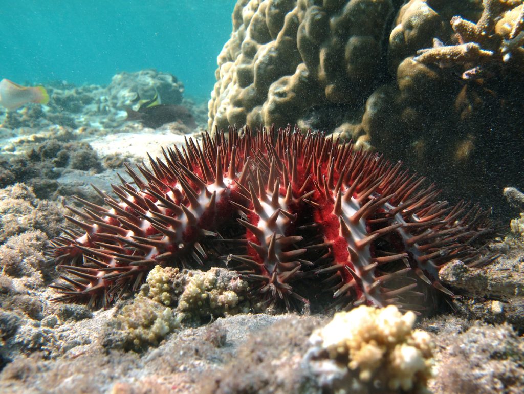 DORNENKRONEN-SEESTERN – Acanthaster planci (Linnaeus, 1758). Dieser tropische Seestern mit einem Durchmesser von etwa 30 cm und – meiner Meinung nach – beeindruckendem Aussehen, mit 16 bis 20 Armen und vollständig bedeckt von bis zu 5 cm langen giftigen Stacheln, ist in der Lage, in kurzer Zeit große Flächen von Korallenriffen zu fressen und bringt damit dieses empfindliche Ökosystem, das bereits durch extreme Klimaereignisse und Verschmutzung belastet ist, in Schwierigkeiten. Aus diesem Grund laufen Kampagnen zu seiner Meldung. (http://www.iucngisd.org/gisd/species.php?sc=1043)