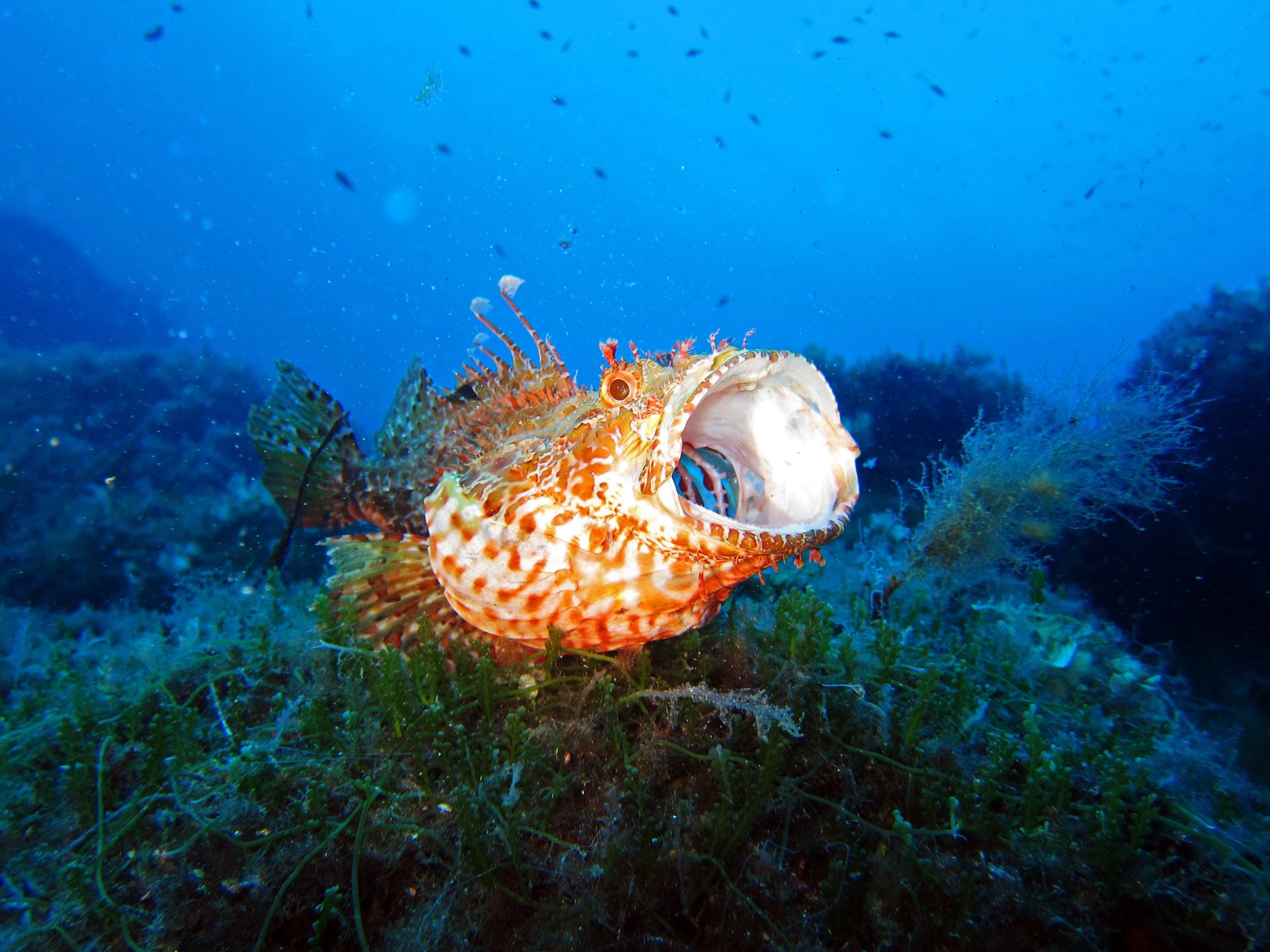 Wir befinden uns hier in einem Gebiet, in dem die Strömungen des Kanals zwischen den Inseln häufig kräftig sind. Dadurch ist regelmäßig mit vorbeiziehenden Fischen wie Bernsteinmakrelen und Thunfischen zu rechnen.