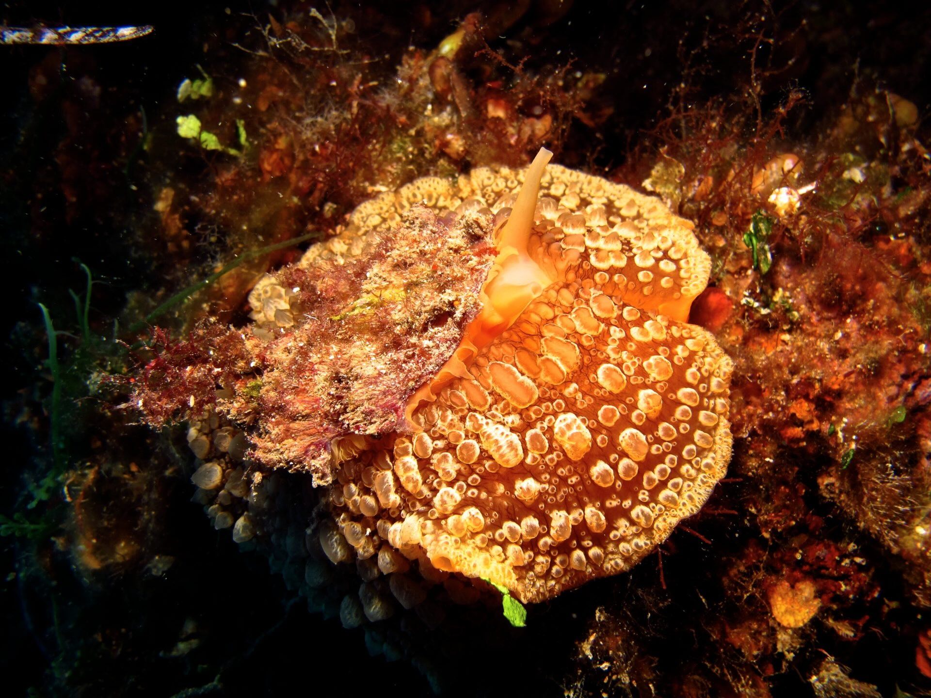 Wir tauchen entlang der inneren Wandseite ab und „springen“ von Terrasse zu Terrasse, bevor wir der Steilwand folgen, die in Richtung offenes Meer abfällt. Auf etwa 30 Metern Tiefe erreichen wir ein felsiges Plateau, danach setzt sich die Wand ins Blau fort und überschreitet deutlich die 40-Meter-Marke. Für dieses Profil biegen wir jedoch nach links ab und tauchen in einen beeindruckenden, längs verlaufenden Canyon ein, der von horizontalen Spalten durchzogen ist. Hier finden Langusten, Conger und Muränen Schutz in farbenprächtigen Felsspalten, die vollständig von Schwämmen (Porifera) und Gelben Krustenanemonen (Parazoanthus) bedeckt sind.