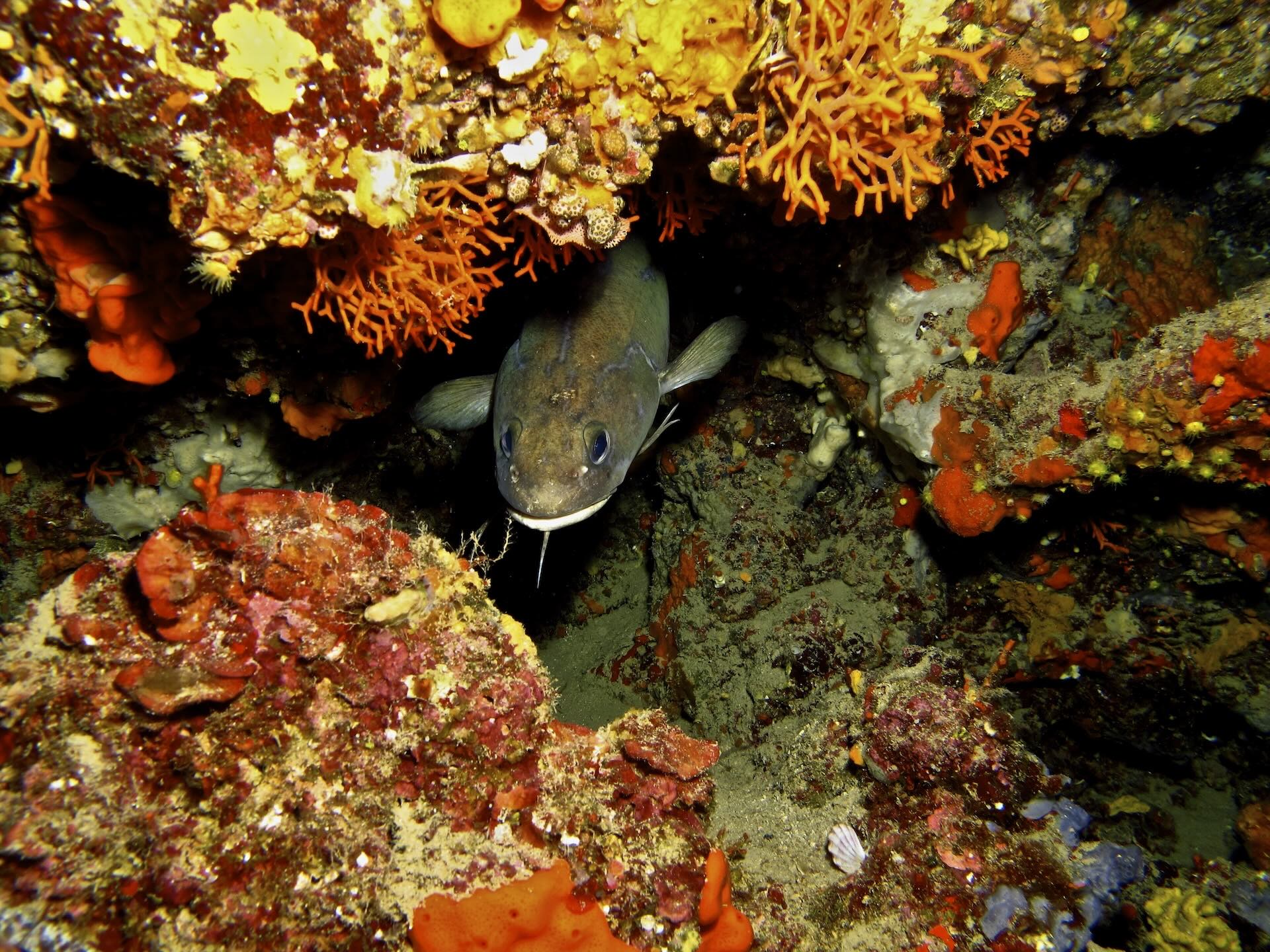 Mit etwas Glück kann man in dieser Tiefe einen schlafenden Kleingefleckten Katzenhai (Scyliorhinus canicula) entdecken, der zwischen Felsen und Sand ruht. Begegnungen mit pelagischen Fischen sind hier hingegen eher selten.