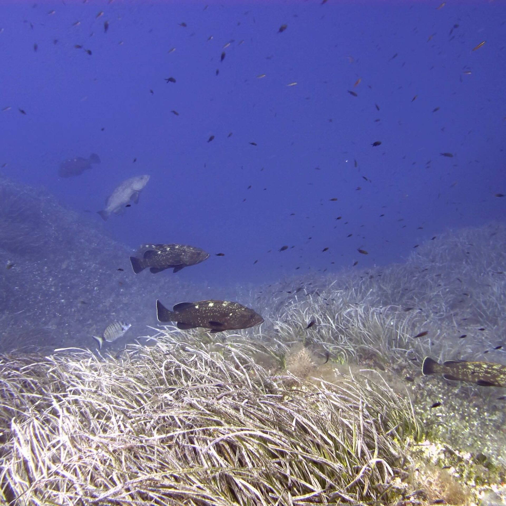 Der interessanteste Bereich ist jedoch der flachere Teil, da man hier konstant mit großen Zackenbarschen und Umberfischen schwimmen kann, während Dentex, Barrakudas und häufig auch große Bernsteinmakrelen um die Taucher kreisen.