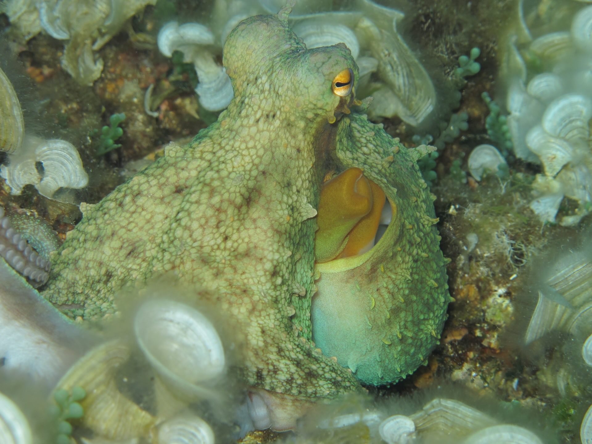 Si raggiunge la franata esterna e la si segue fino al punto di maggiore profondità (circa 22 mt). Qui in ogni insenatura scopriamo qualcosa di diverso: Gronghi e Murene che condividono le tana, grossi Polpi che vanno a spasso, curiose Cerniotte e una vastissima gamma di Nudibranchi (Flabellina, Cratena Peregrina, Hypselodoris), mentre intorno a noi nuotano branchi di Saraghi e Tanute.