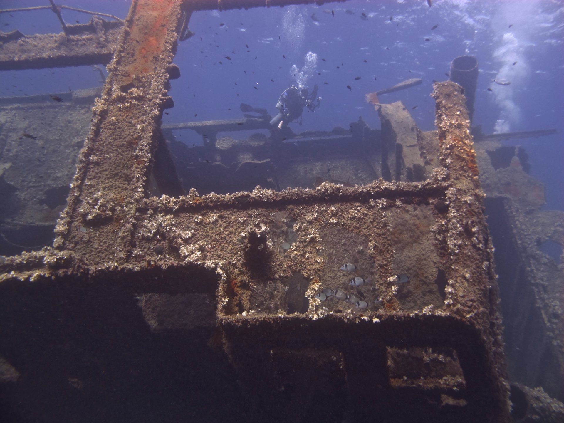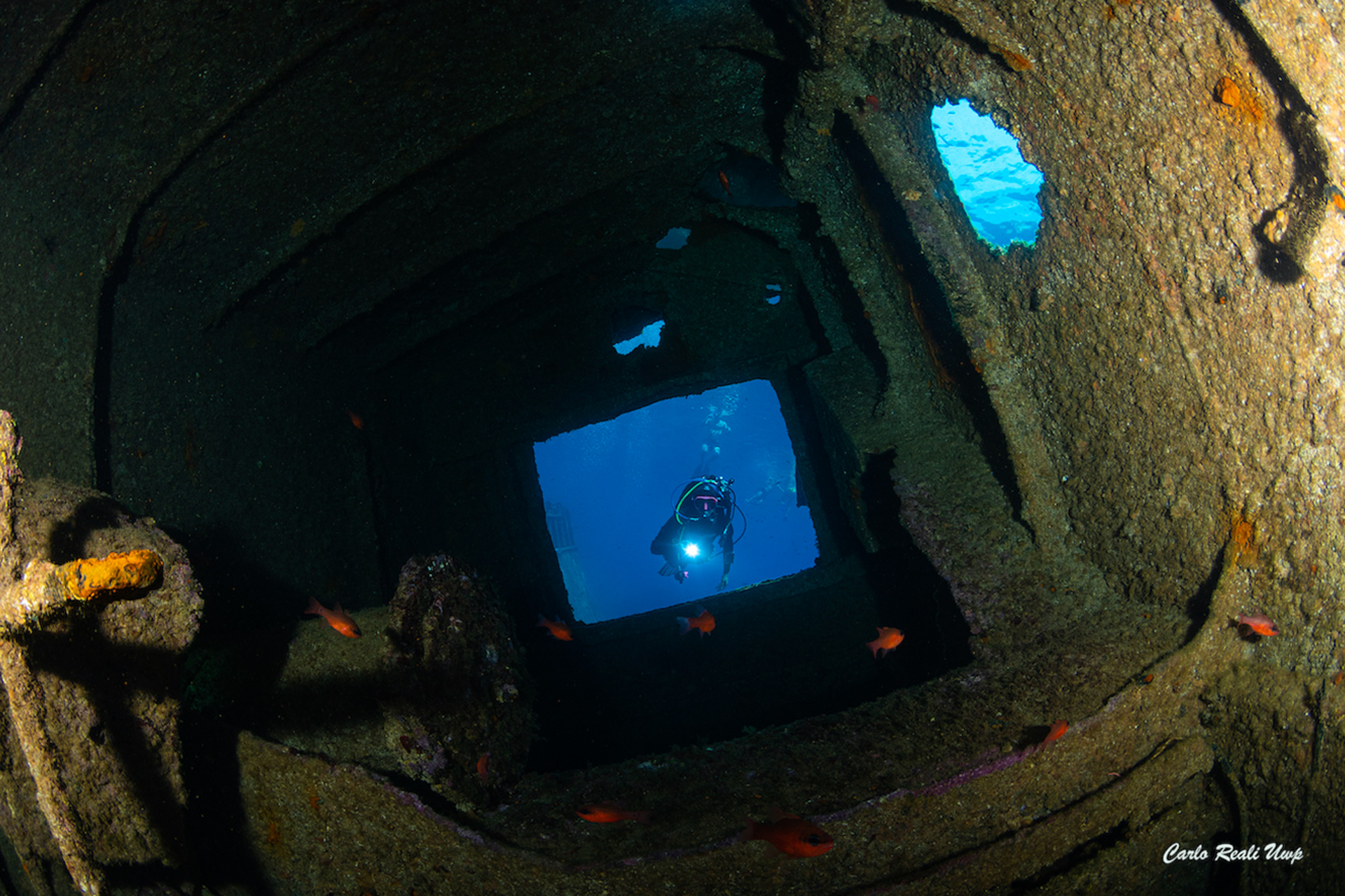 La plancia è facilmente visitabile, attraverso l’enorme apertura superiore. Passando dentro il fumaiolo possiamo arrivare senza particolari problemi, dritti fino alla sala macchine dove é ancora ben riconoscibile l’intero apparato motore. Due ampie aperture, situate a poppa, permettono di risalire lungo un corridoio dove tra suggestivi giochi di luce, creati dai raggi del sole che penetrano attraverso le feritoie e gli oblò, si giunge fino alla plancia di comando. La prua accartocciata sullo scoglio dell’Ogliera crea una specie di tunnel colonizzato da Margherite di Mare (Parazoanthus) e abitata da sospettose Corvine.