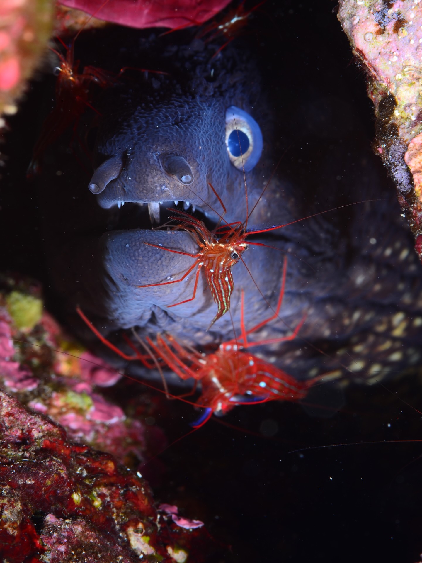 Si procede verso sud soffermandoci a guardare nelle spaccature per sorprendere grossi Scorfani e Polpi, poi si lascia lo scoglio più grande per compiere un rapido giro intorno ad altri due scogli più piccoli ma ricchi di vita: Murene, Gronghi e Polpi sono ovunque, nella Posidonia possiamo anche scorgere Corvine e Dentici in caccia.
